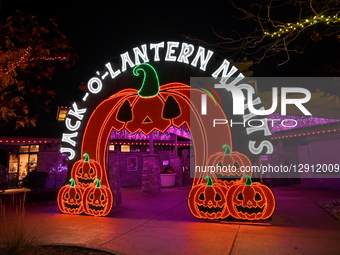 Jack-o'-lantern displays illuminate the pathways during the Jack-O'-Lantern Nights event at the Racine Zoo in Racine, Wisconsin, on October 25, 2025. Hundreds of glowing pumpkins featuring intricate carvings and Halloween-themed decorations light up the night as visitors stroll through the zoo's festive exhibits. The annual event celebrates the Halloween season with illuminated art, fall decorations, and family-friendly attractions.