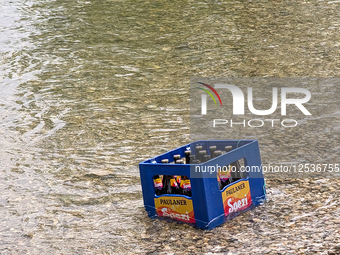 A blue crate with bottles of Paulaner Spezi is cooled in the Eisbach stream in the English Garden in Munich, Germany, on July 6, 2025.