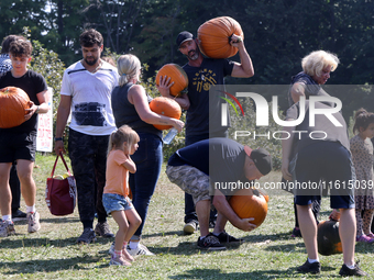 People carry freshly picked pumpkins from a pumpkin patch at a farm in Stouffville, Ontario, Canada, on September 22, 2024.