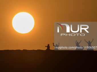 People ride on a camel along the Sealine Sand Dunes against the backdrop of the last sunset of the year 2024 in Sealine, Qatar, on December 31, 2024. The Sealine Desert, one of the world's unique places where the desert meets the sea, is located about 50 kilometers from Doha, the capital of Qatar.