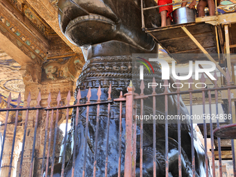 Tamil Hindu priests perform special prays as they bathe a large stone idol of the bull Nandi at the Brihadeeswarar Temple (also known as Brihadisvara Temple, Brihadishvara Temple, Big temple, RajaRajeswara Temple, Rajarajeswaram and Peruvudayar Temple) is a Hindu temple dedicated to Lord Shiva located in Thanjavur, Tamil Nadu, India. The temple is one of the largest temples in India and is an example of Dravidian architecture built during the Chola period by Raja Raja Chola I and completed in 1010 CE. The temple is over 1000 years old and is part of the UNESCO World Heritage Site known as the 'Great Living Chola Temples', comprising of the Brihadeeswarar Temple, Gangaikonda Cholapuram and Airavatesvara temple.