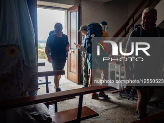 Pilgrims affix a stamp to their pilgrim credentials as they walk to Muxia in Galicia, on June 20, 2025.