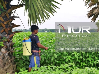 A farmer applies pesticide in a jute field under the scorching sun in Faridpur, Bangladesh, on May 23, 2025. This is part of routine crop management