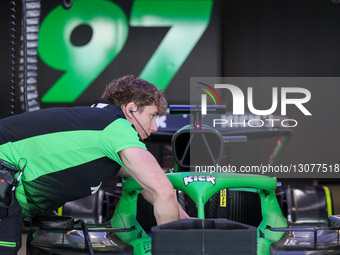 A Stake F1 Team Kick Sauber mechanic works during F1 Testing at Yas Marina Circuit in Abu Dhabi, United Arab Emirates, on December 9, 2025.