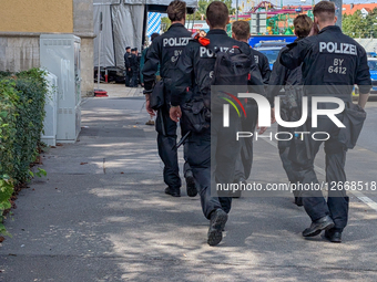 German police officers patrol near the Augsburger Plaerrer in Augsburg, Bavaria, Swabia, Germany, on August 23, 2025.