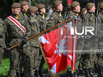 A member of the 7th Pomeranian Brigade of Territorial Defense is seen during a commemorative event outside the Monument to the Defenders of the Polish Post Office. The Defence of the Polish Post Office in Gdansk was one of the first acts of WW2 in Europe. 56 members of the Polish personnel defended the building for over 15 hours against assaults by over 180 SS Danzig Home Defence, local SA formations and special units of Danzig police. On Thursday, September 1st, 2022, in Gdansk, Pomeranian Voivodeship, Poland.