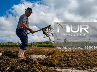 A Portuguese farmer is seen cleaning a beach. While walking the Portuguese Camino Coastal Route, on June 2023.