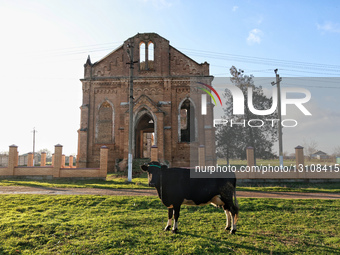 A cow stands outside the ruins of the Lutheran church built by German colonists in Dolynivka village, Bilhorod-Dnistrovskyi district, Odesa region, Ukraine, on December 12, 2025.