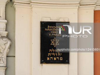 A plaque marks the headquarters of the Jewish Religious Community in Prague with inscriptions in Czech and Hebrew. It is mounted on the exterior of a historic building in the Jewish Quarter in Prague, Czech Republic, on May 11, 2025.