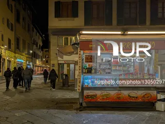 The brightly illuminated I Barocciaio street food stall is open on a cobblestone street in Florence, Italy, on November 22, 2025. The stall sells local specialties like Lampredotto and quick meals, highlighting the bustling informal business and economic trade contributing to the vibrant evening city life in the Tuscan city of Florence.