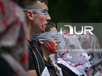EDMONTON, CANADA - JUNE 28: Chained in silent protest to represent Ukrainian prisoners of war held by Russia, members of Edmonton's Ukrainian community gather on Whyte Avenue for the Return Alive rally on the International Day in Support of Victims of Torture, June 28, 2025, in Edmonton, Alberta, Canada.