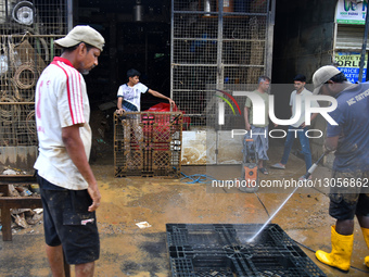 Two men clear thick mud and damaged items from a local food shop after floodwaters sweep through the area following Cyclone Ditwah in Kaduwela, on the outskirts of Colombo, on December 4, 2025.