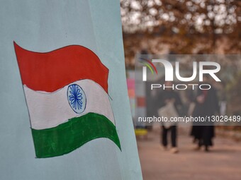 College students walk past a painting of India's national flag during Indian Constitution Day celebrations in Srinagar, Jammu and Kashmir, on November 26, 2025. Constitution Day, or Samvidhan Divas, is celebrated annually on November 26 to mark the adoption of the Indian Constitution on November 26, 1949, which comes into effect on January 26, 1950.