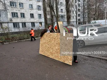 Women carry an OSB panel outside a residential building damaged in a Russian strike in Odesa, Ukraine, on December 4, 2025. Falling debris from Russian drones and the blast wave injures seven people, damages 2,370 windows in 1,086 apartments, and causes a fire at an energy infrastructure facility