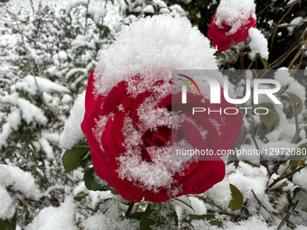 "Roses are covered with snow during the first snowfall of the..."