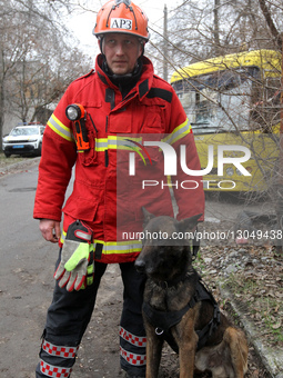 An emergency worker and a rescue dog participate in a response effort following a Russian ballistic missile strike in Dnipro, Ukraine, on December 1, 2025. On Monday, December 1, Russian troops launch a ballistic missile on the central Ukrainian city, killing four people and injuring more than forty. The strike destroys enterprises, an administrative building, four academic institutions, and the same number of high-rise buildings, as well as two service stations and more than fifty cars in the city.