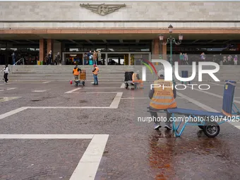 Porters wearing orange safety vests, including one with ''PORTER SERVICE'' clearly labeled, sit on and stand by their specialized luggage carts on the wet, paved plaza outside the Venezia Santa Lucia train station entrance in Venice, Veneto, Italy, on November 17, 2025.