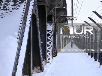 EDMONTON, CANADA - FEBRUARY 11: The iconic steel High Level Bridge spans the North Saskatchewan River, seen from the north bank on a cold winter afternoon in Edmonton, Alberta, Canada, on February 11, 2025.