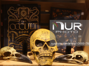 Occult-themed items are displayed during Halloween Nights of Lights a few days before Halloween in Toronto, Ontario, Canada, on October 26, 2025. Halloween Nights of Lights is an illuminated maze of over 1.5 million LED and RGB lights and a haunted house not for the faint of heart.