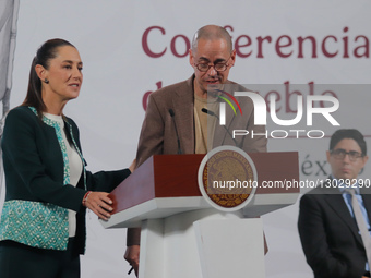 Mexico's President Claudia Sheinbaum Pardo is seen behind while Jose Antonio Pena Merino, Head of the Agency for Digital Transformation and Telecommunications, speaks during a news conference about the new Mexican supercomputer, 'Coatlicue', the first in Latin America, which has a large data processing capacity, in Mexico City, Mexico, on November 26, 2025.