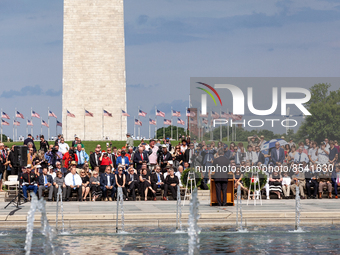 Senator Joe Manchin (D-WV) speaks at the World War II Memorial during a wreath-laying ceremony for Chief Warrant Officer 4 Hershel Woodrow "Woody" Williams, Retired, the last surviving WWII Congressional Medal of Honor recipient. Williams passed away June 29, 2022, at the age of 98. Wiliams earned the Medal of Honor during the Battle of Iwo Jima and served in the Marine Corps before a career at the Department of Veterans Affairs.