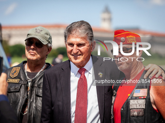 Senator Joe Manchin (D-WV) takes a photo with two veterans at the World War II Memorial prior to a wreath-laying ceremony for Chief Warrant Officer 4 Hershel Woodrow "Woody" Williams, Retired, the last surviving WWII Congressional Medal of Honor recipient, after he passed away June 29, 2022, at the age of 98. Wiliams earned the Medal of Honor during the Battle of Iwo Jima and served in the Marine Corps before a career at the Department of Veterans Affairs.