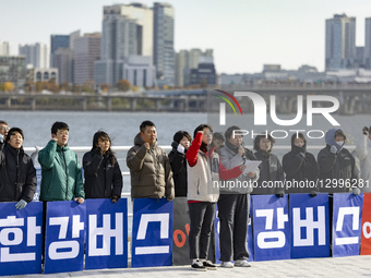 Environmental activists with the Seoul Environmental Union chant during a news conference outside the Han River bus pier in Yeouido, Seoul, South Korea, on November 17, 2025, urging the city to halt operations and conduct a full review of the Han River bus project after a vessel runs aground near the Jamsil pier two days earlier.