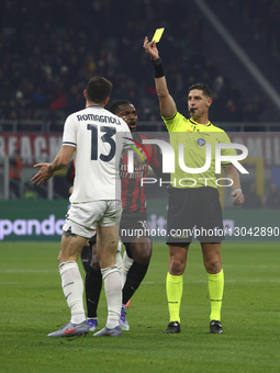 Alessio Romagnoli receives a yellow card during the Serie A match between AC Milan and SS Lazio at Giuseppe Meazza stadium in Milano, Italy, on November 29, 2025