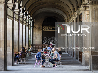 Several customers taking a drink at the tables of a restaurant terrace at Les Rambles de Barcelona when Barcelona begins Phase 1 which allows the installation of bar terraces and restaurants on public roads, respecting the distances between tables due to the Covid-19 infection. On May 25, 2020 in Barcelona, Spain.