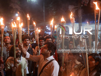 A torch procession takes place demanding justice for attacks and persecution against Bauls across the country and calls for the release of Baul Abul Sarkar, in Dhaka, Bangladesh, on November 28, 2025.