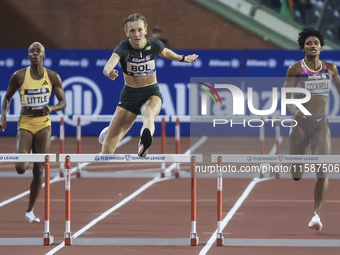 Femke Bol of the Netherlands pictured during the 400m Hurdles Women race at the Wanda Diamond League 2024 final event and 48th edition of the Memorial Van Damme athletics meeting. The Dutch athlete winner of the race, is a medallist at the Olympic Games and specialises in the 400 metres hurdles, where she is the 2023 World Champion, and in the 400 metres, where she is the 2024 World Indoor Champion and the short track world record holder. Femke Bol run among Cockrell Anna, Salmon Shiann, Little Shamier, Folorunso Ayomide, Couckuyt Paulien, Russell Janieve, Knight Andrenette. King Baudouin Stadium in Brussels, Belgium on September 14, 2024