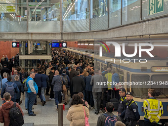 A large crowd of passengers waits to board a U2 subway train at Messestadt West station in Munich, Germany, on May 7, 2025. The scene reflects peak commuter congestion during the Smarter E Europe 2025 energy industry trade fair held at Messe Muenchen.