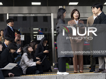 Na Kyung-won, a lawmaker from the People Power Party, speaks to reporters after leaving the Seoul Southern District Court in Yangcheon District, Seoul, South Korea, on November 20, 2025. The court imposes fines of 24 million won on Na for her role in the National Assembly's 2019 fast-track clash, 19 million won on former party leader Hwang Kyo-ahn, and 11.5 million won on current floor leader Song Eon-seok.