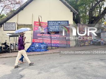 A couple walks past the Kerala Lokayukta Legislature Complex building in Thiruvananthapuram (Trivandrum), Kerala, India, on April 3, 2024.