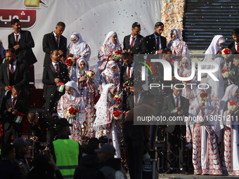 Family and friends watch as 54 brides and grooms gather on a stage during a mass wedding called ''The Dress of Joy,'' organized by the Al-Fares Al-Shahm Foundation, in Khan Yunis, Gaza Strip, on December 2, 2025. ''The Dress of Joy'' is a project that helps 54 grooms in the Gaza Strip to get married, an initiative that coincides with the United Arab Emirates' (UAE) 54th National Day.