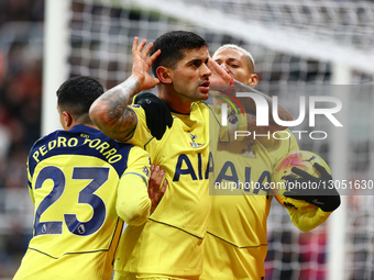 Cristian Romero of Tottenham Hotspur celebrates scoring during the Premier League match between Newcastle United and Tottenham Hotspur at St. James's Park in Newcastle, on December 2, 2025.