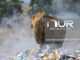 A wild elephant forages through a garbage dump in Tissamaharama, Sri Lanka, on September 6, 2025, highlighting the growing human-wildlife conflict.
