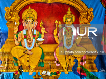 Mural with the images Lord Vinayagar (Lord Ganesh) and Lord Murugan at the Arasadi Vinayagar Temple (Arasadi Sithi Vinayagar Kovil) in Jaffna, Sri Lanka.