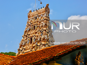 Detail of the gopuram (tower) of the Arasadi Vinayagar Temple (Arasadi Sithi Vinayagar Kovil) in Jaffna, Sri Lanka.