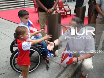 Former New York Governor Andrew Cuomo greets young supporters in front of St. Patrick's Church during the 68th Annual Puerto Rican Day Parade on 5th Avenue in New York City, on June 8, 2025.