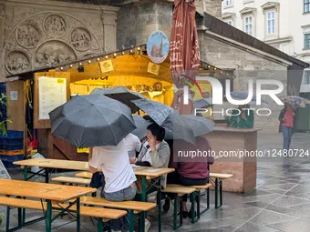 People with umbrellas stand at food stalls on Stephansplatz near St. Stephen's Cathedral in Vienna, Austria, on June 7, 2025. Several yellow canopies and wooden booths are set up in the square during rainfall.