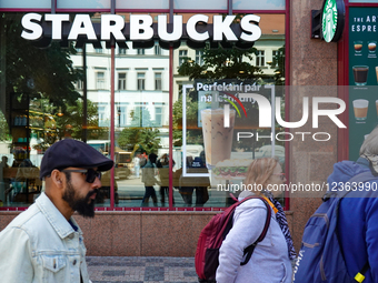 A man and a woman walk past a corner Starbucks coffee shop with large reflective windows and outdoor seating in Prague, Czech Republic, on May 12, 2025. The location sits in a pedestrian zone and features clear storefront branding and a modern urban setting.