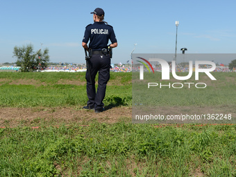 Strict security between during celebrations, as Pope Francis finishes a Final Mass to mark the end of World Youth Day 2016 with over 1.5 million pilgrims from all around the world in Brzegi, near Krakow. On Sunday, 31 July 2016, in Brzegi, Krakow, Poland.