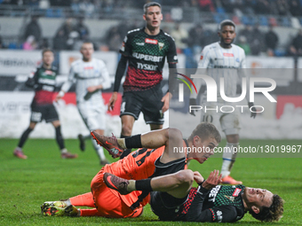 RZESZOW, POLAND – NOVEMBER 22: GKS Tychy goalkeeper Kacper Kolotylo collides with teammate Julian Keiblinger during the 17th round of the Betclic 1 Liga match between Stal Rzeszów and GKS Tychy, in Rzeszów, Subcarpathian Voivodeship, Poland, on November 22, 2025.