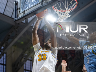Silas Sunday, 33, of the Hofstra Pride goes up for a layup during an NCAA men's basketball game at The Palestra in Philadelphia, United States, on November 29, 2025
