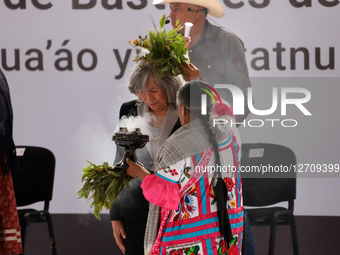 Supreme Court minister Maria Estela Rios Gonzalez receives a traditional purification ceremony conducted by representatives of Indigenous and Afro-Mexican peoples during the swearing-in ceremony where the nine ministers of Mexico's highest court receive the baton of command at the main square Zocalo in Mexico City, Mexico, on September 1, 2025.