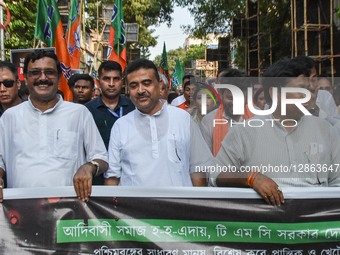 BJP leaders Suvendu Adhikari and Sukanta Majumder are seen during a protest rally in Kolkata, India, on October 15, 2025, which is held in protest against the alleged attack on BJP tribal leaders by TMC goons, according to reports.