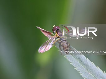 The Eastern Flower Fly (Syrphus knabi) rests on a leaf in Toronto, Ontario, Canada, on July 9, 2025.