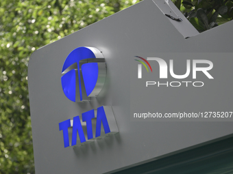 Tata signage is visible during the launch of the TATA EV charging hub in Mumbai, India, on September 9, 2025.