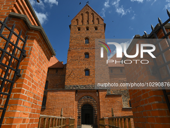 TRAKAI, LITHUANIA - JULY 13, 2023: View of the inner yard of Trakai Island Castle on July 13, 2023, in Trakai, Lithuania. Trakai Island Castle is a historic island castle constructed in the 14th century by Vytautas the Great. It holds strategic importance and underwent reconstruction in the 1950s-1960s. Now a major tourist attraction, the castle is part of the Trakai Historical National Park, known for its diverse habitats and rare species. Trakai's history dates back to 4000 BCE, and it was a multicultural city. The park is included in UNESCO's Tentative Lists.